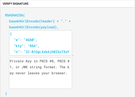 In the case of RSA (e.g., RS256), the private key signs the token, while the public key can be distributed to any party that needs to verify the token’s authenticity. The public key verifies that the token has not been altered and that it came from a trusted source.