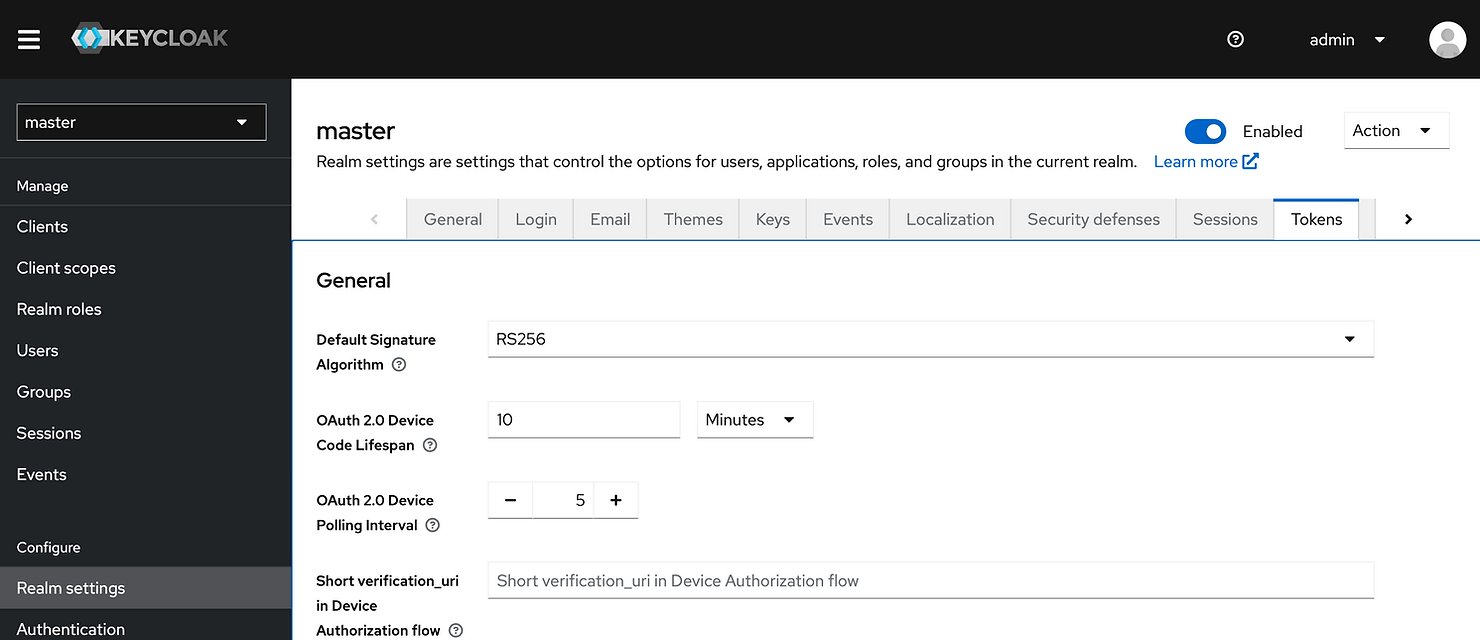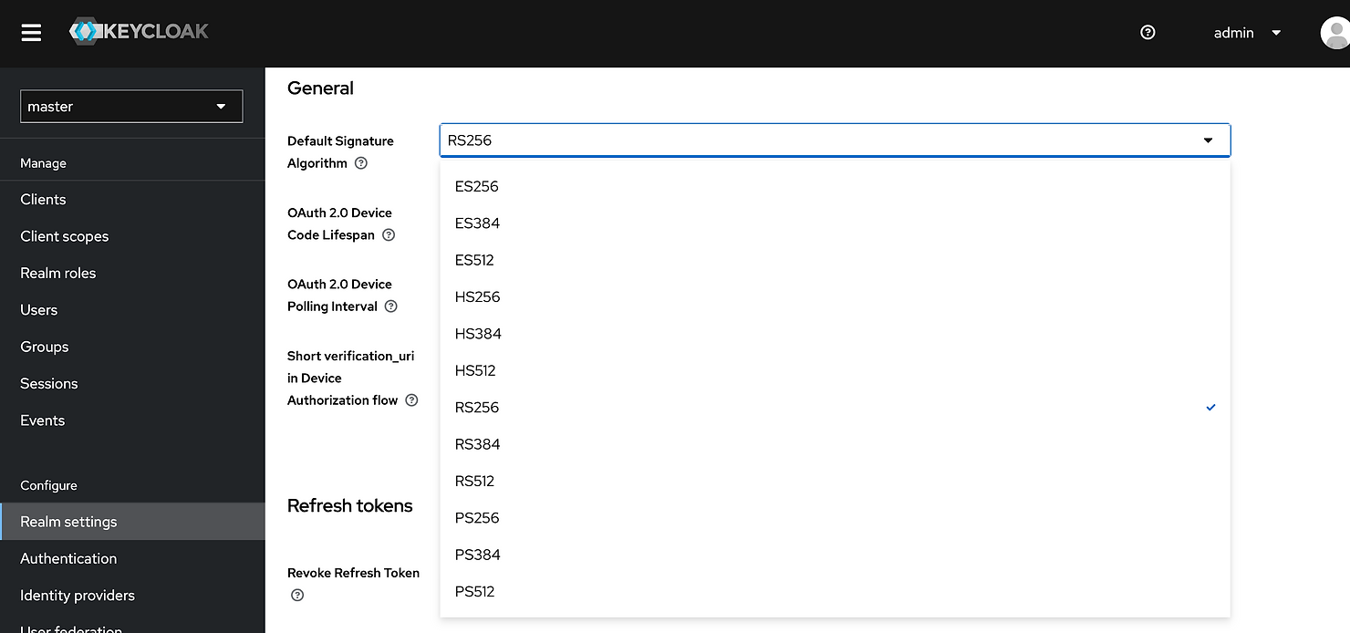 Default Signature Algorithm parameter means default algorithm used to sign tokens for the realm. For example RS256 is selected in below screenshot.