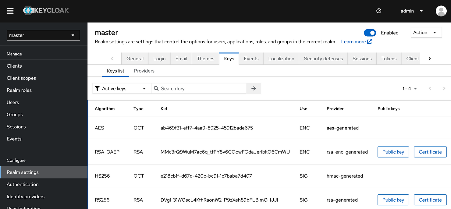 Keycloak also supports asymmetric algorithms like RSA and ECDSA. These algorithms use a public-private key pair: