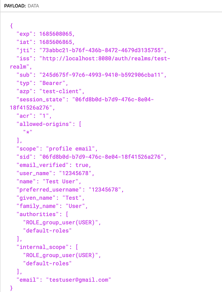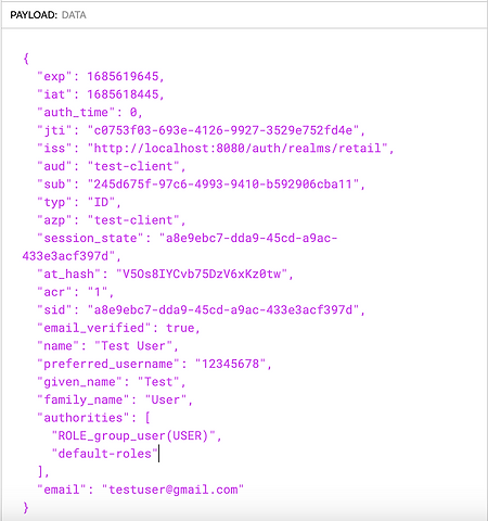 The "authorities" field lists the roles or authorities assigned to the user.